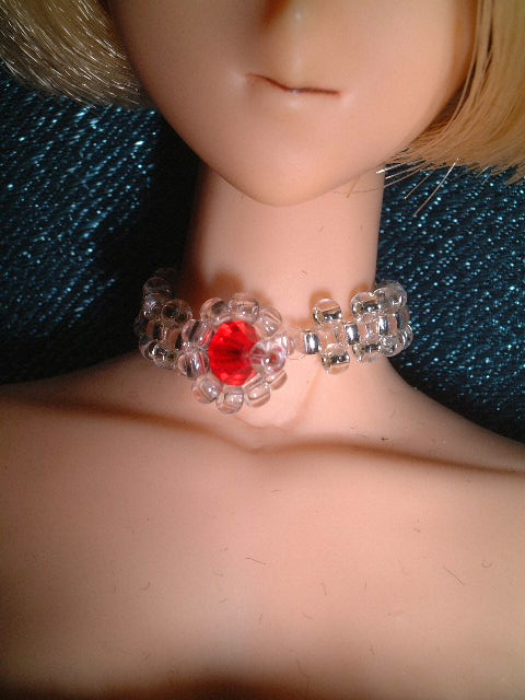 ネックレスもビーズで手作りしました。 ラリエット式で前の赤いスワロフスキービーズで留めるタイプです。